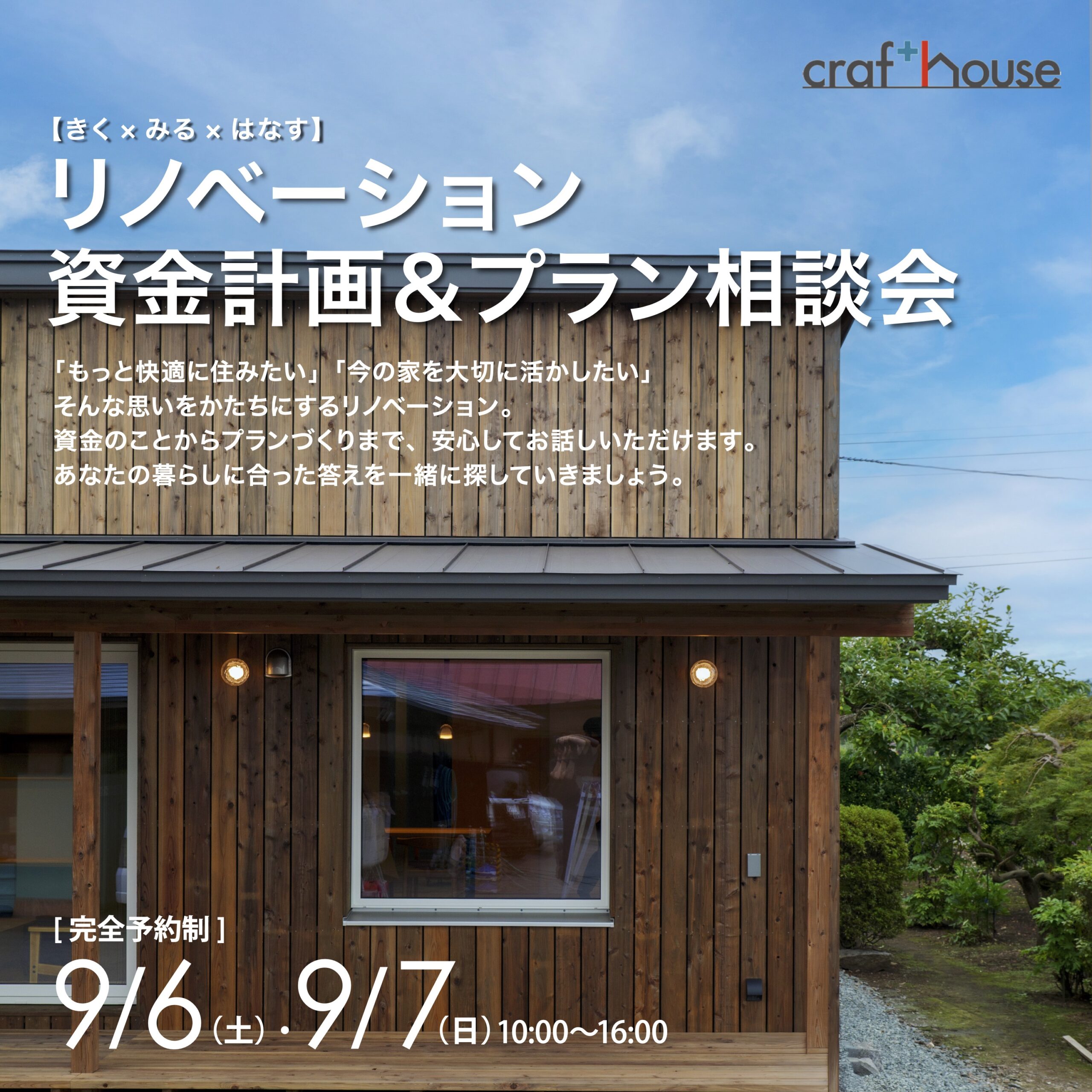今回クラフト・ハウスでは、資金計画からプランづくりまでをじっくりご相談いただける【リノベーション資金計画&プラン相談会】を開催します。間取りの変更や快適性能の向上、デザインリフレッシュなど、住まいのお悩みをリセットし、新しい暮らしへと再生するお手伝いをします。未来の住まいづくりを一緒にスタートしましょう!